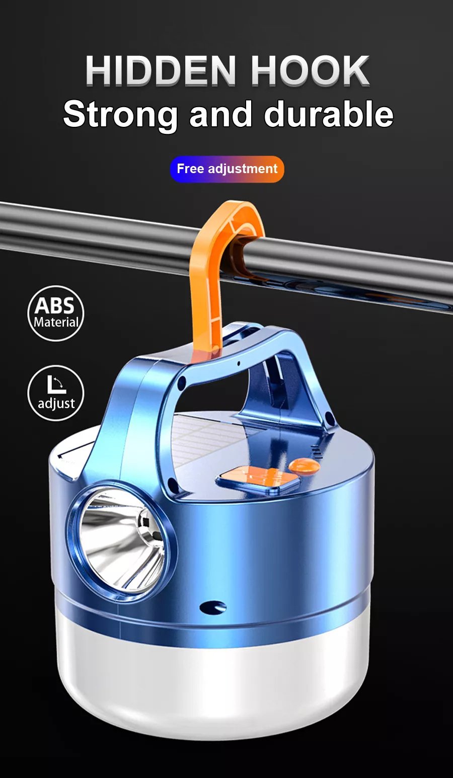 3 brightness modesSolar chargingattached hook for hangingRange: 100 SFBattery lift 5-6Can also be used as a power bank