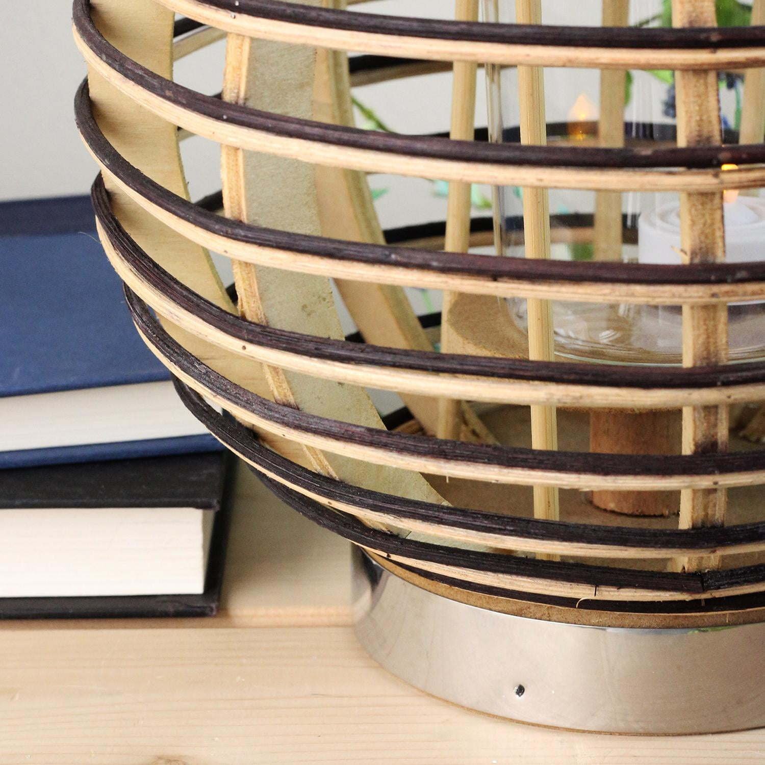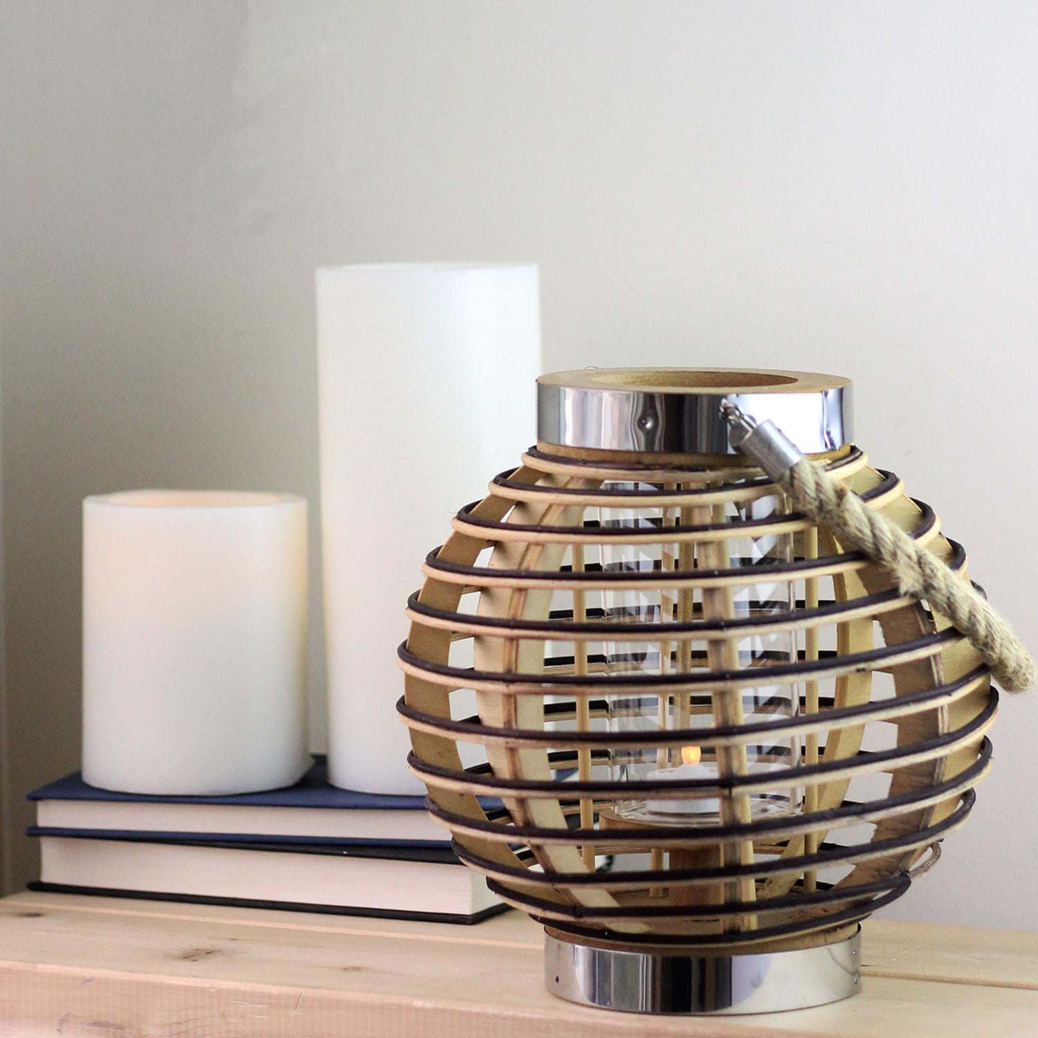 This open aired lantern features horizontal stripes of natural and dark stained rattan with striking metallic finishes