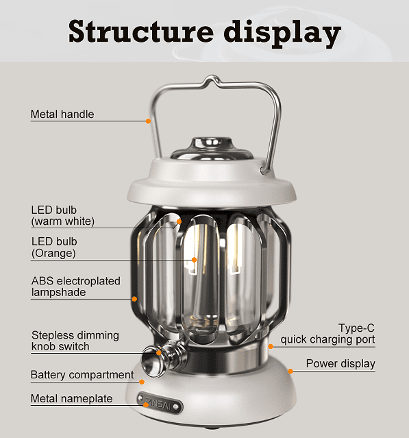 1.Private dimming / lamp bottom universal stand ports / Soft warm light / retro aesthetic / TPU lampshade / silicone switch / handle suspension / light luxury / look / SOS rescue / top light source / flashlight / bicycle lighting